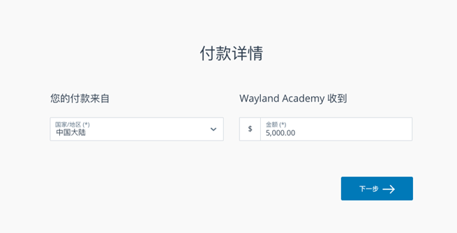 4、输入付款详情:按照页面说明输入个人基本信息并提交付款订单,根据所选付款方式的不同,可能需要在线上传由学校出具的录取通知或付款通知。
