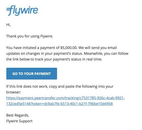 6、追踪与确认:您可随时登陆飞汇(Flywire)账户查询支付进度。并且飞汇(Flywire)也会在每个付款阶段向您发送“状态更新”短信和电子邮件通知,直到款项最终确认到账。
