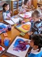 室内老师和室外老师还都要负责各自范围内的ART WORK,就是让小朋友们尝试不同方式不同工具的画画和手工制作,每个孩子都是天生的艺术家,这话真的不假:)。画画所用的颜料都是可水洗的,虽然我们给 小孩子都带上专门画画用的围裙,但经常还是有小朋友会把手上脸上都弄得一塌糊涂。这一点上亚裔孩子的表现都很有趣,好象他们家长的教育方式约好了似的,几 乎90%亚裔孩子在绘画时都会很小心的保护自己身上的干净程度,洋人孩子的手和脸倒是每次自由创作之后都是五颜六色的,他们还都乐呵呵的,不象亚裔孩子着 急的就把手伸过来表示很yucky:)