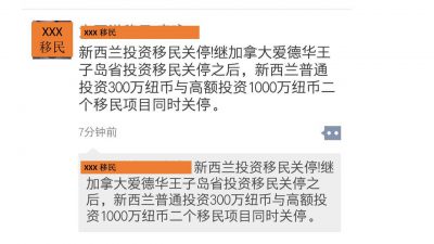 2018年9月20日,国内许多移民中介陆续发出包含“继加拿大爱德华王子岛省投资移民关停之后,新西兰的普通投资300万纽币与高额投资1000万纽币两个投资移民项目同时关停”的消息。