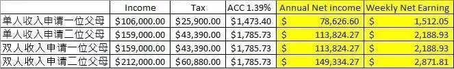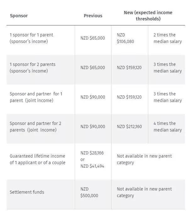 | 1个担保人支持2位家长(资助人收入) | $65,000 NZD | $159,120 NZD | 工资中位数的3倍 |