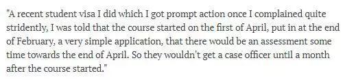 据Matt Robson表示,他有个学生客户,课程从四月一号开始,申请是二月底递交的,本应该是个很简单的操作,结果移民局说要到四月底才能完成最初评估。律师说课程开始一个月之后,都不一定能分到case officer。