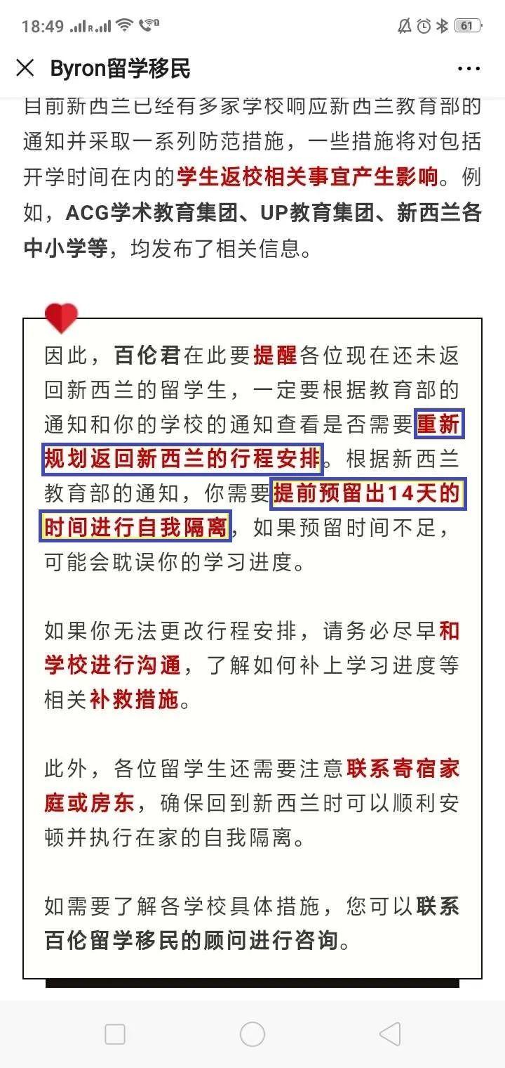 新年后不久,有很多留学生在看了百伦君1月底的微信公众号文章提醒后立刻修改了行程计划,提前回到了新西兰,并安全度过了14天的隔离期,顺利开学了。
