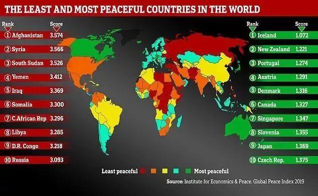【绿色越深代表约和平与安全,红色越深代表越不和平和不安全】