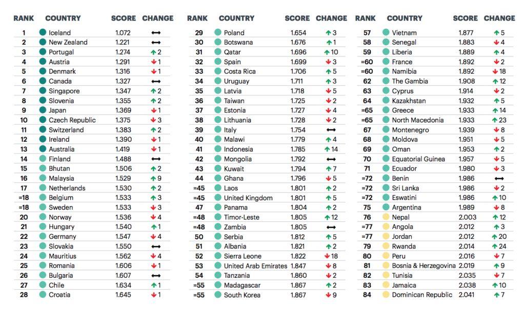 腐败 – 最少腐败,腐败感知指数为9.4 [5]