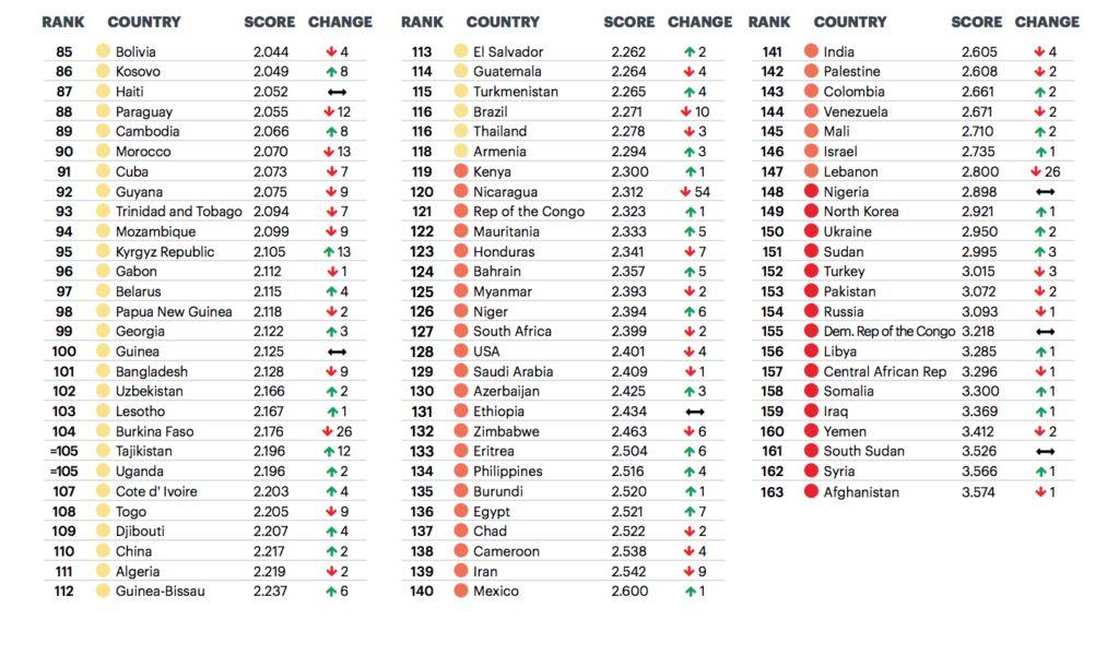 我国在此次排名中名列110名,属于中等安全国家,与我国同一档次的国家有巴西等国。