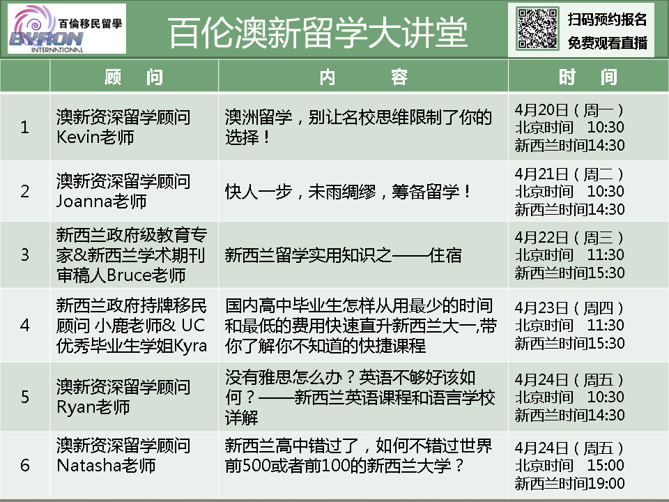 扫码就可以预约报名,免费观看百伦留学资深留学顾问团的直播讲座了。详细直播内容和讲座嘉宾介绍请参看本公众号次头条及后续文章。