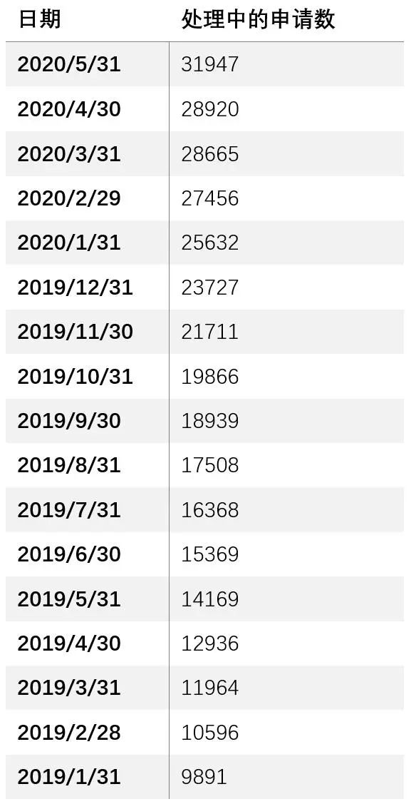 根据移民局官方数据,现在已经完成EOI抽取这一步,并正式递交技术移民申请,等候分配移民官进行处理的申请数,已经从2019年1月31日的9891份一路激增达到2020年5月31日的31947份。