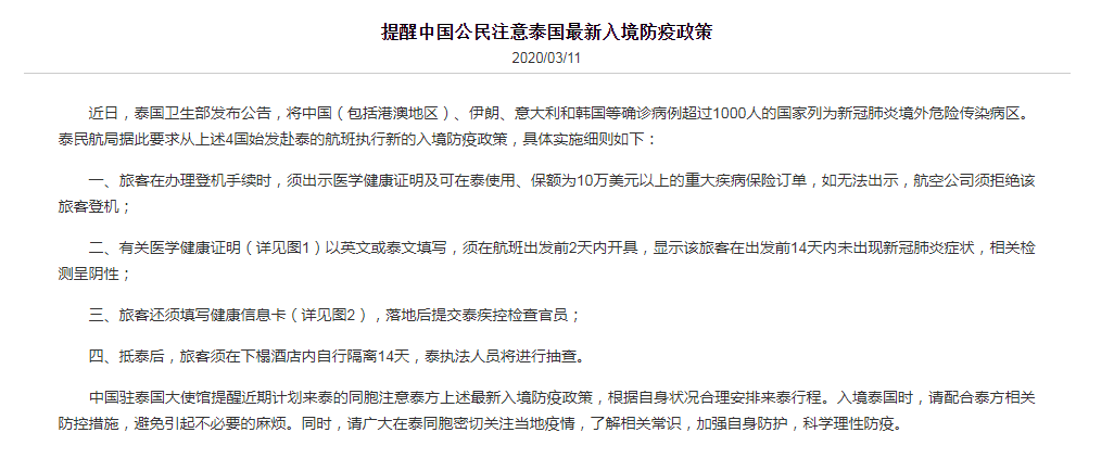 近日,泰国卫生部发布公告,将中国(包括港澳地区)、伊朗、意大利和韩国等确诊病例超过1000人的国家列为新冠肺炎境外危险传染病区。泰民航局据此要求从上述4国始发赴泰的航班执行新的入境防疫政策,具体实施细则如下: