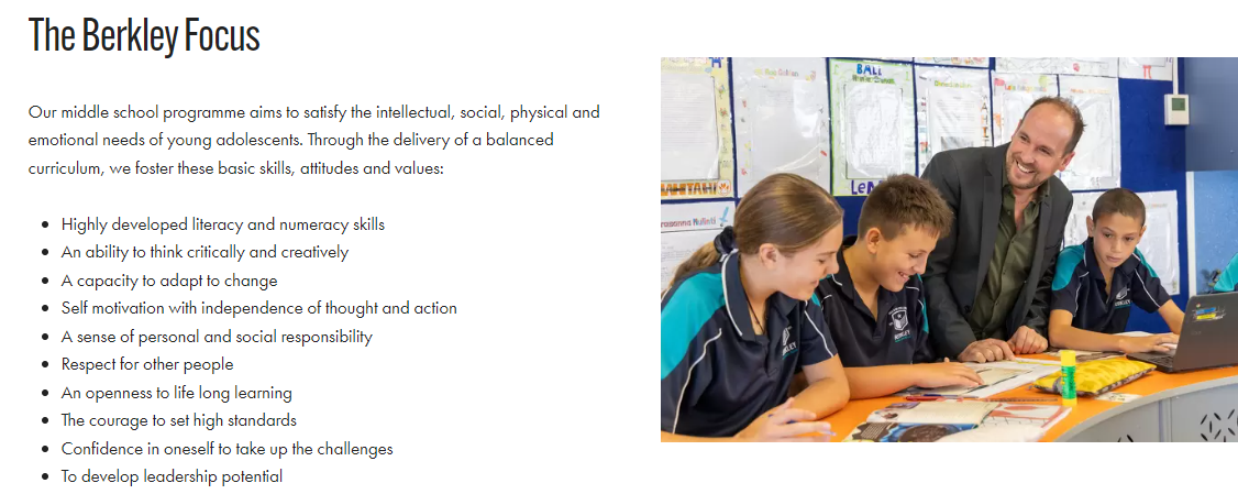 Berkley Normal Middle School 是新西兰少有的提供 Year 7–9 教育的中学,结合 IB PYP 课程框架和专为青少年设计的教学模式,提供丰富的课程和活动,注重学生的全面发展。对于希望孩子在初中阶段接受国际化教育、培养探究精神和全球视野的家庭来说,Berkley 是一个值得考虑的选择。