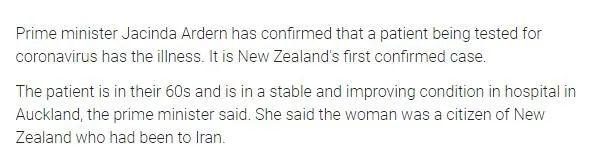 新西兰总理Jacinda Ardern刚刚确认,新西兰确诊一例新型冠状病毒病例,这是新西兰首例确诊病例。该患者六十多岁,现在在奥克兰的医院处于稳定和改善的状态。这名妇女是去过伊朗的新西兰公民。
