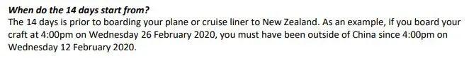 答:14天是指登机或登船前往新西兰之前的14天。例如,如果您在2020年2月26日星期三下午4:00登船,您必须自2020年2月12日星期三下午4:00起一直在中国大陆境外。