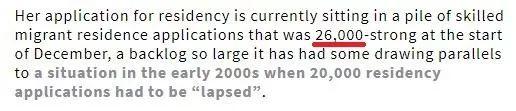 以来自英国的Kate为例,她于2019年1月递交了技术移民申请,到现在依然在等待审理。当她在今年1月向移民局询问进度时,移民局表示,2018年12月的申请还没有处理完。有报道称,截至去年12月初,新西兰依然有超过26,000份技术移民申请尚未处理。