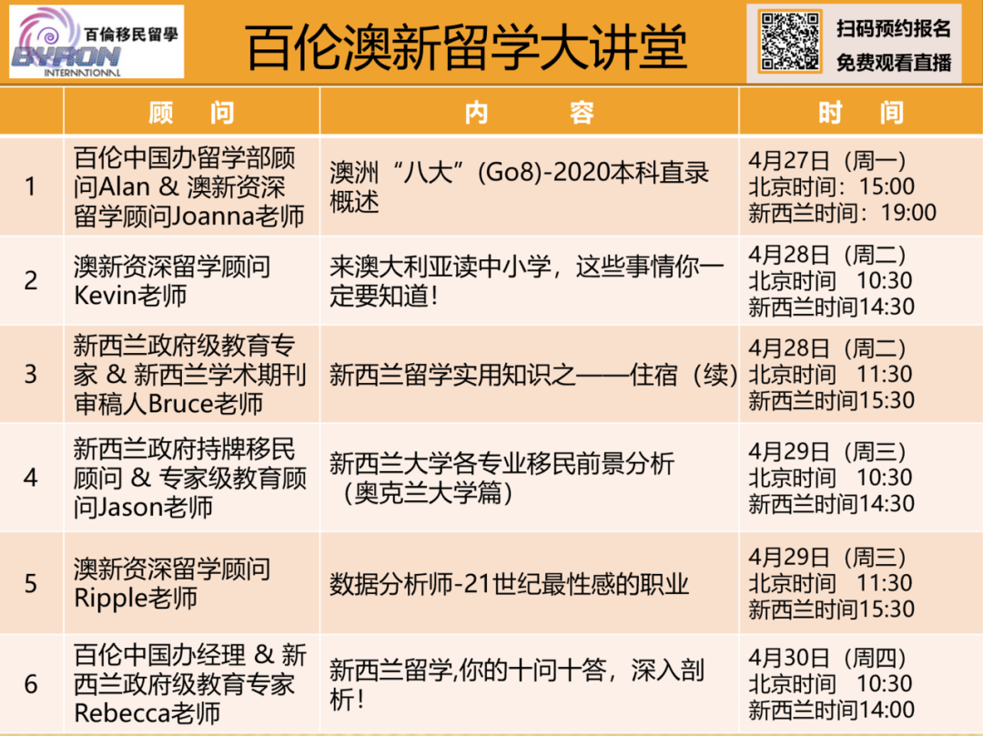 因此,百伦移民留学的政府认证的持牌移民顾问团和资深留学顾问团携手为大家精心准备了系列线上公益直播讲座,话题涵盖您想了解的、需要了解的澳新留学移民的方方面面。