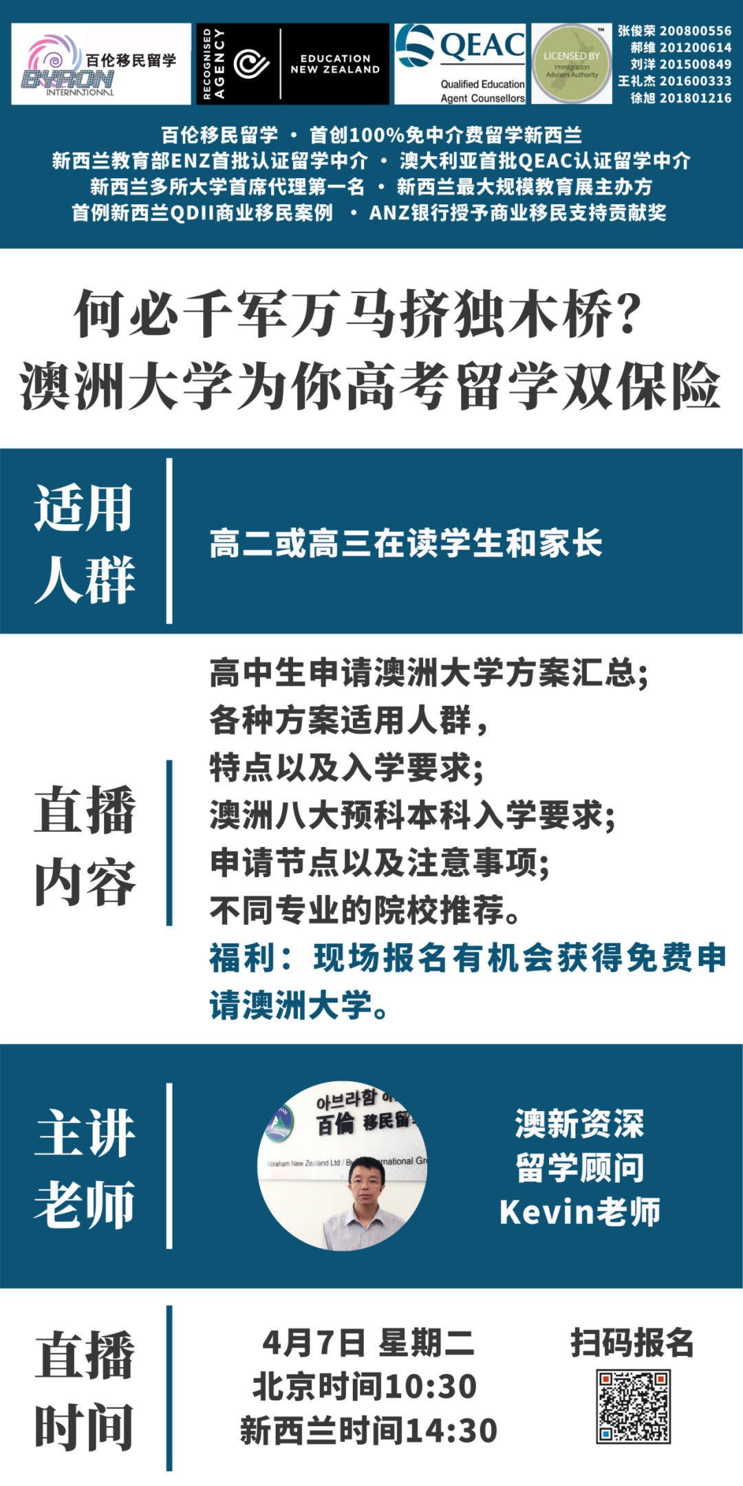 精通澳洲,新西兰国家的留学申请与办理。在超过十年的留学行业工作中,帮助无数莘莘学子实现了出国留学的梦想。做事,仔细认真,服务,热情周到。