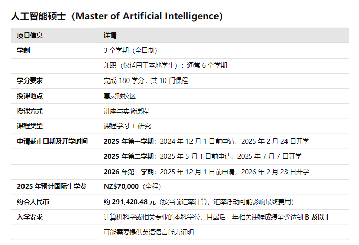 研究生课程:学校提供人工智能硕士(Master of Artificial Intelligence,MAI)学位,通常需要12到16个月的全日制学习,最长可达两年。
