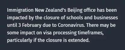 受到新冠状病毒肺炎疫情影响,中国政府决定将新年假期延长,新西兰移民局北京办公室也将关闭至2月3日,学生签证及访客签证处理将会受到一定程度的影响。