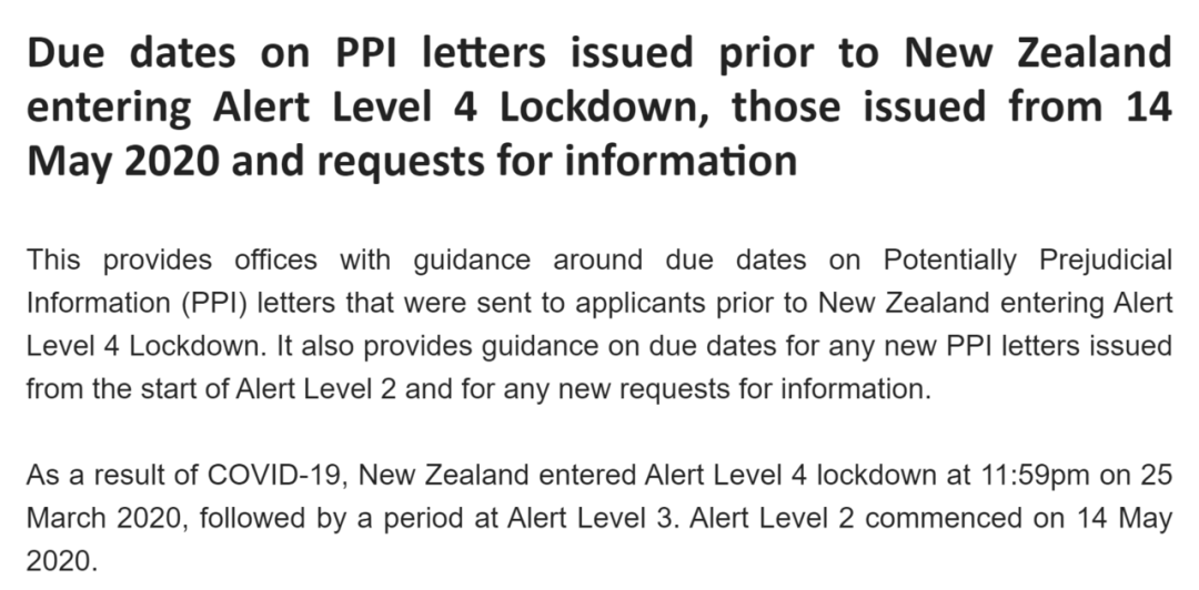 对于在2020年3月25日之前发送的PPI,回复截止日期延至2020年6月12日(星期五)(新西兰进入2级警报后的4周,除去6月1日公共假期)。此项延期的目的是让申请人有足够的时间获取任何所需的信息,在必要时寻求移民建议并做出相应的回应。