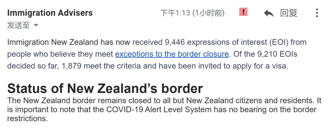 1. 新西兰边境依然保持关闭。目前收到的9446份特殊入境申请意向书(EOI)中,已审理9,210个意向书,有1879个符合标准,并已被邀请申请签证。