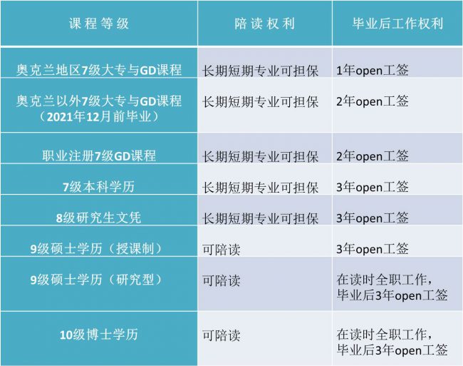 2018年11月26日之前,如果主申请人来新西兰留学,就读新西兰的8级研究生文凭课程(PgD)或以上课程并能获得学生签证,就可以担保配偶的工作签证。配偶可以在新西兰合法工作,通过找工作或者自雇来养家,18岁以下的子女也可以免费就读新西兰的公立学校。