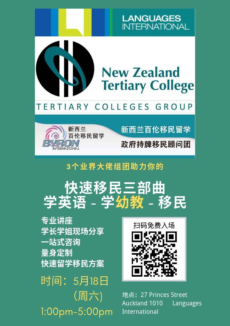 5月18日(周六)下午1:00-5:00,新西兰顶尖教育行业的大佬们将一起为你讲解英语学习、留学、工作、移民的攻略、答疑解惑;还有成功通过幼教移民的学长、学姐们为你现场讲述他(她)们的昨天、今天,带你了解真实的行业情况。
