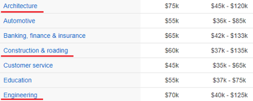 根据本地招聘网站Trade Me Jobs显示,新西兰建筑和工程相关的行业平均年薪在6万-7.5万纽币(约27-34万人民币)的水平:
