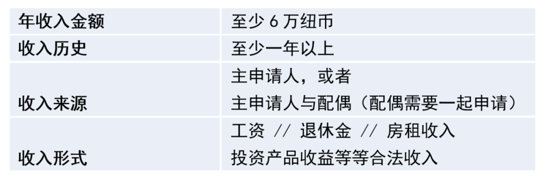 主申请人配偶合计每年有超过60000纽币的年收入(按当前汇率不到30万人民币,只要是合法收入,工资租金利息都可以计算,可以是工资,分红,房租,退休金等);