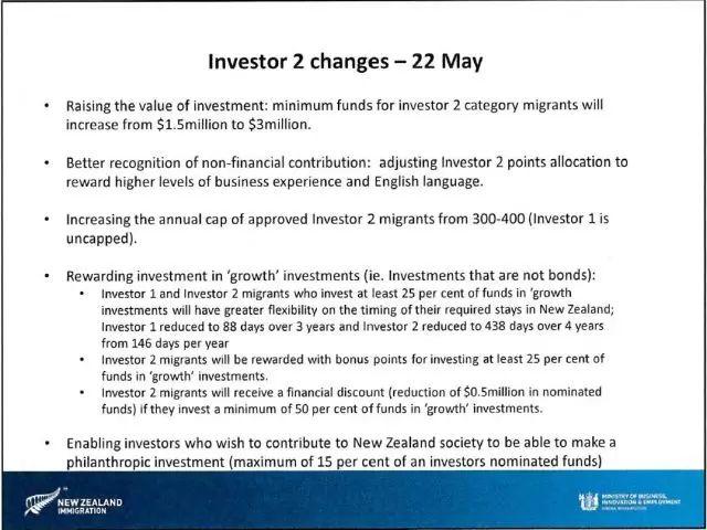 新西兰移民局在2016年12月初公布了关于投资移民新西兰的新政策,该政策将于2017年5月22日开始正式实施。新政策主要调整了二类投资移民新西兰的相关标准,其中最为引人注目的是对于投资二类的资金门槛要求从原来的150万纽币起,大幅上升到300万纽币起;申请配额从每年300个增加至每年400个;同时对新西兰有益的『增长型投资』新西兰移民局将『热烈欢迎』并给予额外的加分。