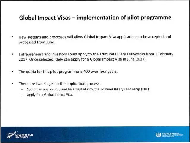 17年2月1日起,受委托的第三方埃德蒙·希拉里奖学金(Edmund Hillary Fellowship,EHF)正式开放了针对全球影响力签证的会员申请,目的是吸引海外的青年企业家、投资者和创新团队。新西兰全球影响签证提供400个配额,试行周期4年,每年发放100个左右的名额。EHF基金会每年开放两次申请,每次会从申请者中筛选出50人,第一批申请截止日期为4月30日。