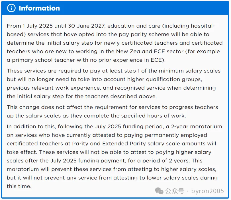 5月28日,新西兰教育部发布重大政策变动:自2025年7月1日起,加入工资对等(Pay Parity)计划的早教中心将不再强制为新入职的教师(包括持证硕士毕业生、从海外来的教师、以及转岗的小学教师)提供按资历核算的起薪,仅需支付工资等级表的最低档——年薪$57,358(约合每小时$27.58)。这一薪资远低于目前新西兰技能移民打分系统(6分制)所要求的中位工资标准$31.61/h,引发了行业与国际学生群体的强烈震动。
