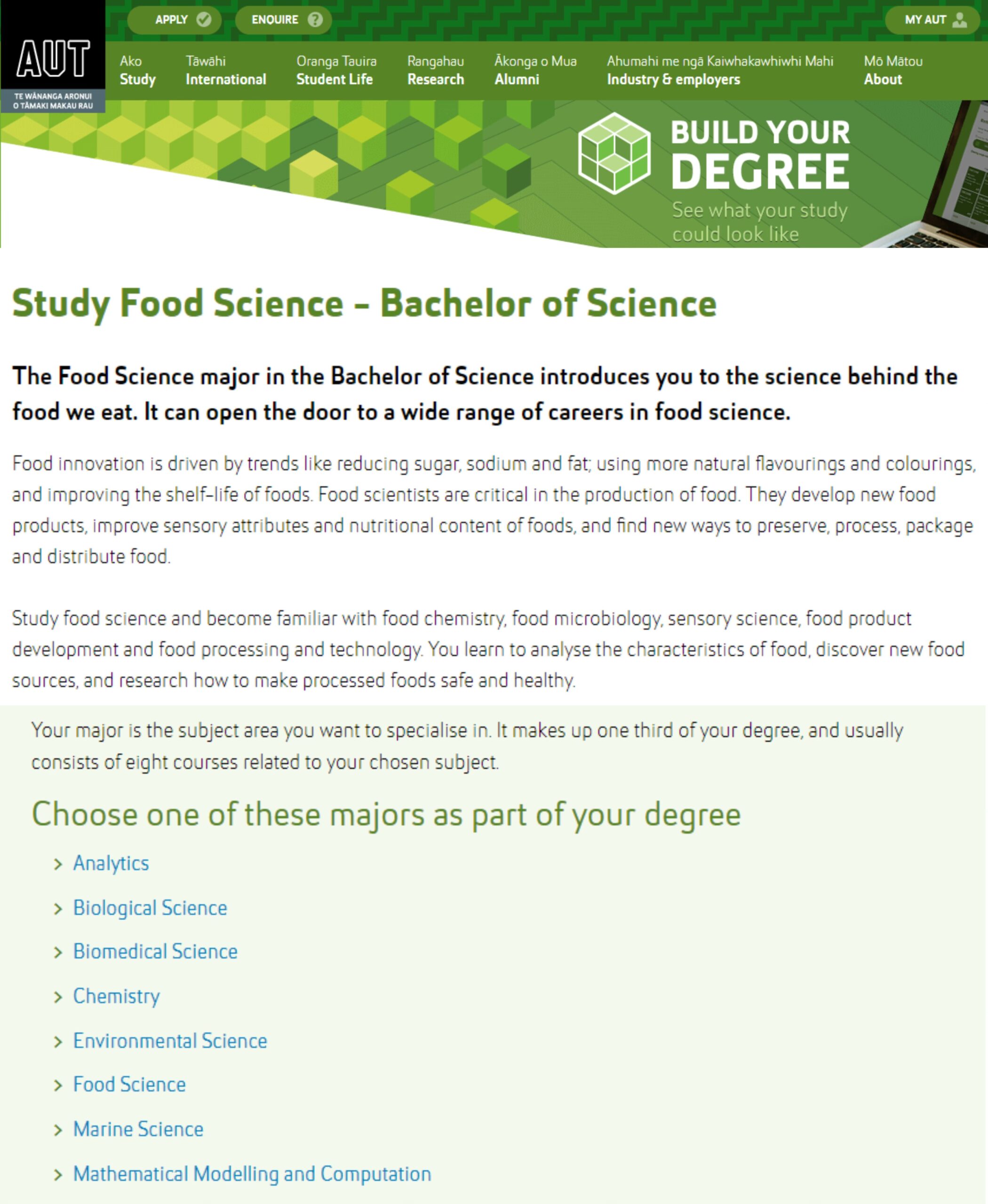 在AUT理学学士学位中,主修专业占整个学位的三分之一,通常包含8门相关课程。学生可以选择一个,也可以搭配第二主修,比如食品科学 + 化学的组合。