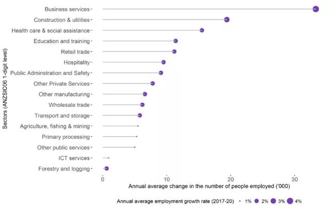 从行业发展上看,劳动力需求最大的行业将集中在商务、建筑施工、公共健康与社区服务(包括教育、医疗等)四大板块。其中,20%的就业增长将来自商务的发展,尤其是高技能型职业,并集中在奥克兰和惠灵顿两大城市地区。