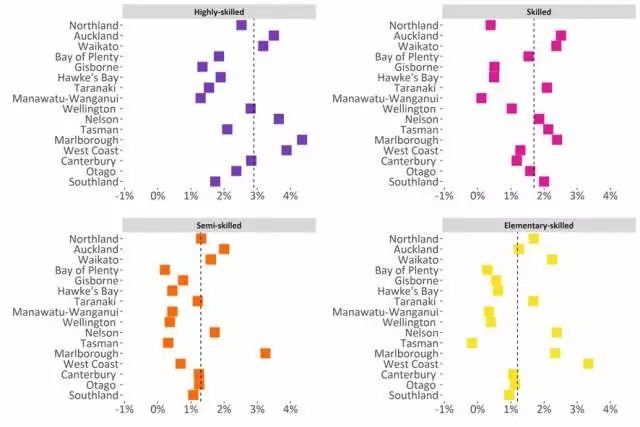 与前几年相比,将有更多的传统农业地区实现就业需求的增长。受城市区域扩张的影响,北岛北部、新普利茅斯地区与怀卡托地区将额外需要施工工程、零售贸易与酒店管理人才。