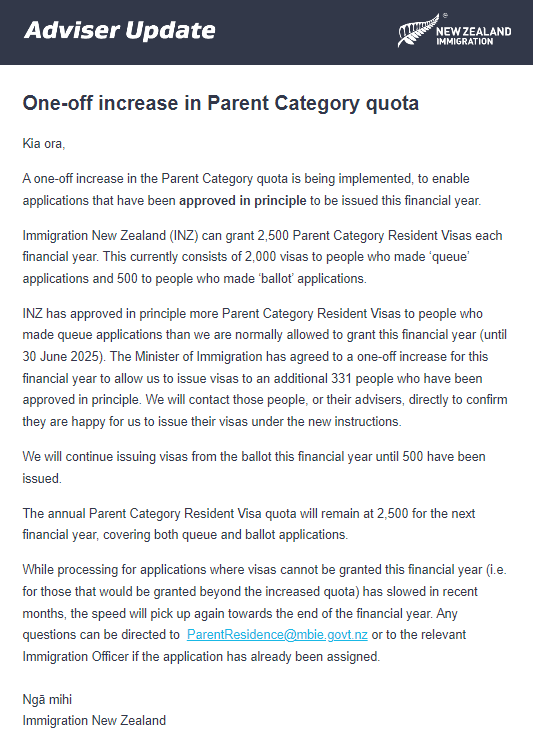 新西兰移民局(INZ)将实施一次性的父母团聚类别居留签证(Parent Category Resident Visa)配额增加,以确保已获原则性批准(Approved in Principle, AIP)的申请人在本财年(截至2025年6月30日)内能够获批签证。